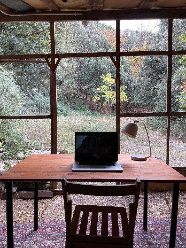 El Mas consta de dues plantes. A la planta de dalt trobem l’habitació, amb llum natural, armari i taula per treballar, a més de l’estudi-biblioteca, on es fan les sessions d’acompanyament. Al primer pis hi tenim la cuina, el mejador i la sala d’estar amb xemeneia. Per qui vulgui gaudir d’una experiència a l’exterior (totalment recomanable) s’ha habilitat el galliner com espai de treball i una taula a l’entrada del bosc on poder escriure tranquilament.